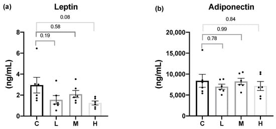 Serum adipokine concentrations after 8 weeks of the melatonin intervention. (a) Serum leptin levels; (b) serum adiponectin levels. All values are presented as the mean ± standard error of the mean (n = 6). Differences between different groups were determined by a one-way ANOVA with Tukey’s test. Black dots represented each sample. Abbreviations: C, control group (ovariectomized (OVX) rats); L, low-dose group (OVX rats treated with 10 mg/kg body weight (BW) melatonin); M, medium-dose group (OVX rats treated with 20 mg/kg BW melatonin); H, high-dose group (OVX rats treated with 50 mg/kg BW melatonin).