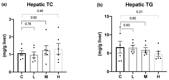 Hepatic lipid contents after 8 weeks of the melatonin intervention. (a) Hepatic total cholesterol (TC) levels; (b) hepatic triglyceride (TG) levels. All values are presented as the mean ± standard error of the mean (n = 6). Differences between different groups were determined by a one-way ANOVA with Tukey test. Black dots represented each sample. Abbreviations: C, control group (ovariectomized (OVX) rats); L, low-dose group (OVX rats treated with 10 mg/kg body weight (BW) melatonin); M, medium-dose group (OVX rats treated with 20 mg/kg BW melatonin); H, high-dose group (OVX rats treated with 50 mg/kg BW melatonin).