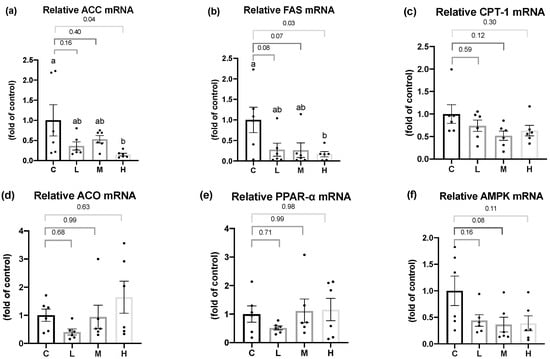 As shown in Figure 3, for the fatty acid synthesis pathway, ACC and FAS mRNA levels in the liver were significantly lower in the H group than in the C group, and a slight decrease was seen in the L and M groups. For the fatty acid oxidation pathway, there were no significant differences in the CPT-1 or ACO mRNA levels in the liver among all the groups. In terms of the mRNA levels of important transcriptional regulators in the hepatic lipid metabolism, such as PPAR-α or AMPK, there were no significant differences among all the groups.