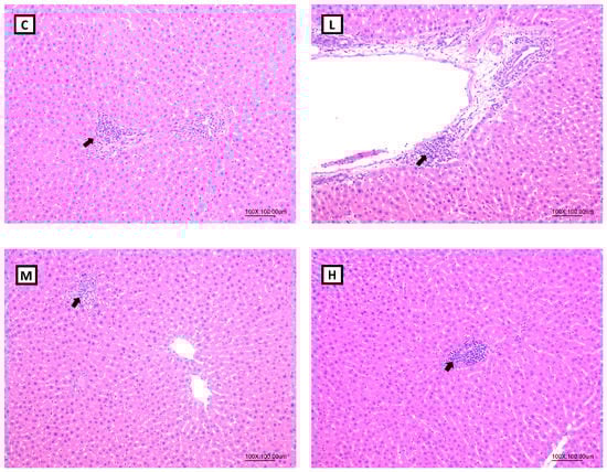 Hepatic histopathology of ovariectomized (OVX) rats after 8 weeks of a melatonin intervention (100×). Arrow: inflammatory cell infiltration. Abbreviations: C, control group (ovariectomized (OVX) rats); L, low-dose group (OVX rats treated with 10 mg/kg body weight (BW) melatonin); M, medium-dose group (OVX rats treated with 20 mg/kg BW melatonin); H, high-dose group (OVX rats treated with 50 mg/kg BW melatonin).