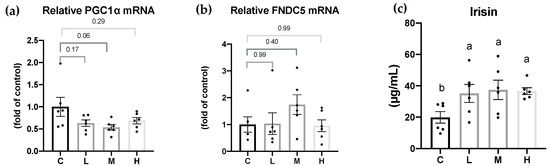 Peroxisome proliferator-activated receptor-gamma coactivator-1α (PGC-1α)/fibronectin type III domain-containing 5 (FNDC5) mRNA levels and serum irisin levels after 8 weeks of the melatonin intervention. Relative (a) FNDC5 mRNA levels in quadricep muscle tissues; and (b) serum irisin levels (c) serum irisin levels. All values are presented as the mean ± standard error of the mean (n = 6). Different superscripts (a, b) indicate a significant difference between different groups at p < 0.05 by a one-way ANOVA with Tukey test. Black dots represented each sample. Abbreviations: C, control group (ovariectomized (OVX) rats); L, low-dose group (OVX rats treated with 10 mg/kg body weight (BW) melatonin); M, medium-dose group (OVX rats treated with 20 mg/kg BW melatonin); H, high-dose group (OVX rats treated with 50 mg/kg BW melatonin).
