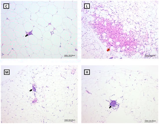 Pathological histologic images of gonadal adipose tissues after H&E staining (100×). Red arrow: brite/beige cell, black arrow: inflammation. All values are presented as the mean ± standard error of the mean (n = 3). Abbreviations: C, control group (ovariectomized (OVX) rats); L, low-dose group (OVX rats treated with 10 mg/kg body weight (BW) melatonin); M, medium-dose group (OVX rats treated with 20 mg/kg BW melatonin); H, high-dose group (OVX rats treated with 50 mg/kg BW melatonin).