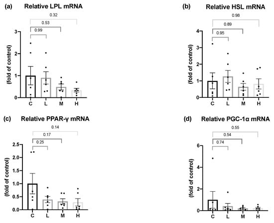 Lipid metabolism-related mRNA levels in gonadal white adipose tissues after 8 weeks of the melatonin intervention. Relative (a) lipoprotein lipase (LPL), (b) hormone-sensitive lipase (HSL), (c) peroxisome proliferator-activated receptor γ (PPAR-γ), and (d) peroxisome proliferator-activated receptor-gamma coactivator (PGC-1α) mRNA levels. All values are presented as the mean ± standard error of the mean (n = 6). Differences between different groups were determined by a one-way ANOVA with Tukey test. Black dots represented each sample. Abbreviations: C, control group (ovariectomized (OVX) rats); L, low-dose group (OVX rats treated with 10 mg/kg body weight (BW) melatonin); M, medium-dose group (OVX rats treated with 20 mg/kg BW melatonin); H, high-dose group (OVX rats treated with 50 mg/kg BW melatonin).