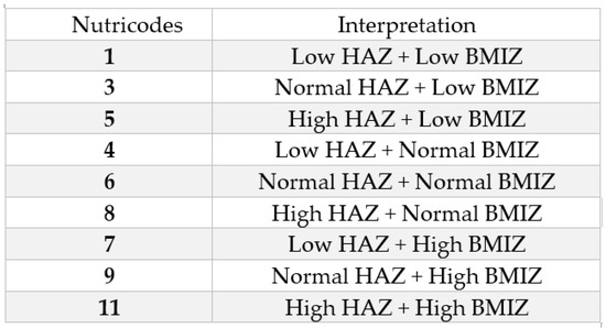The nine nutricodes generated by the combination of HAZ and BMIZ can be seen in Figure 2, and represent the diagnosis of nutritional status [10].