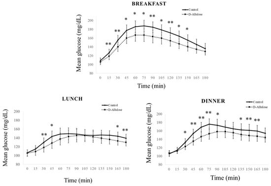 Mean glucose level curves for all meals and each meal during the intake period of each diabetic diet group. Blood glycemic variability at 0 (premeal) to 180 min after the meal in all 20 subjects is shown on the basis of isCGM data. The solid line shows glycemic variability with normal diabetic diet intake, and the dotted line shows glycemic variability with D-allulose-containing diabetic diet intake represents a statistically significant difference (* p < 0.05, ** p < 0.01, linear mixed-effects models) compared with the control group. Data reported as mean ± SEM.