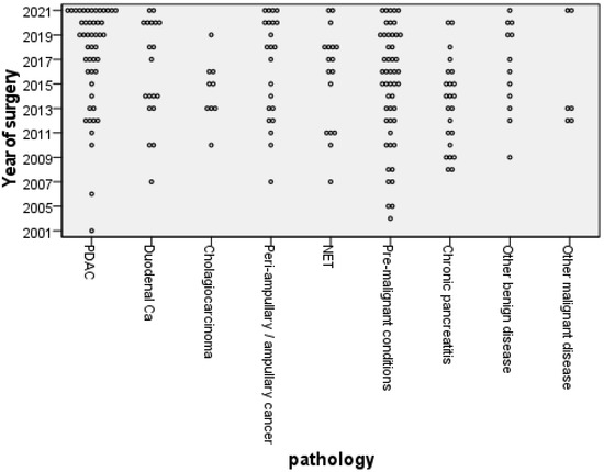 Of the 205 patients followed up over 14 years, 104 (50.7%) were men and the mean age was 61.8 (SD 11.8). One hundred sixty-five (80.5%) underwent a pylorus-preserving pancreatico-duodenectomy, thirty-two a full Whipple, and eight a total pancreatectomy. Of all 205 patients, 5 had additional resections (2× right hepatectomy, 1× vascular resection, 1× hemicolectomy, and 1× nephrectomy). The most common pathological diagnosis was pancreatic ductal adenocarcinoma (PDAC), followed by pre-malignant conditions (intrapapillary mucinous neoplasm (IPMN), familial adenomatous polyposis (FAP), and tubular villous adenoma), with the benign and pre-malignant disease pathologies more prevalent in those long-term survivors (Figure 2).
