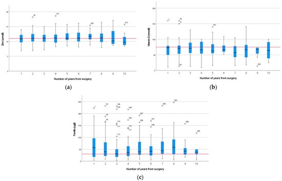 The most prevalent deficiencies were zinc (44%), vitamin D (46%), and iron—assessed as ferritin (42%) (Supplementary Material—Table S1). These did not change significantly with time from surgery (p = 0.636, p = 0.774, and p = 0.257, respectively) (Figure 3). This is despite each individual deficiency being corrected and reflects a new diagnosis of deficiency in those where more than one result was available. There were not sufficient data to carry out repeated measurement analysis on individual patients.