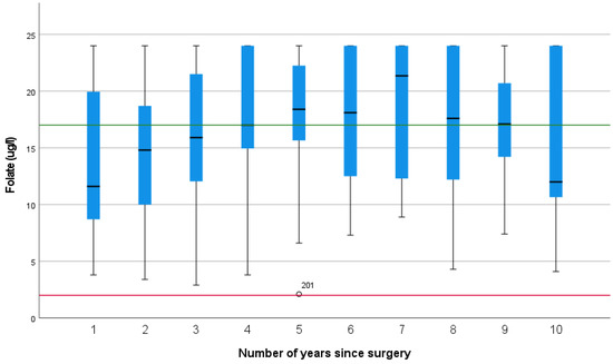 Folate levels over the first 10 years after pancreatico-duodenectomy (The green line represents the upper reference range, and the red line represents the lower reference range).