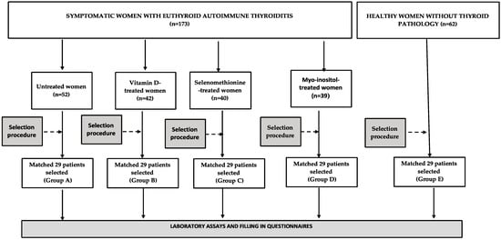The participants of this study were selected among young women (aged 18–45 years) with euthyroid Hashimoto’s thyroiditis, diagnosed six months earlier, and supervised by local healthcare providers cooperating with our research team. Women were eligible for the study if they fulfilled the following inclusion criteria: (a) plasma titers of thyroid peroxidase (TPOAb) and thyroglobulin (TgAb) antibodies above 100 U/mL; (b) ultrasound images suggestive of autoimmune thyroiditis (diffuse hypoechoic echogenicity, parenchymal heterogeneity, echogenic septations, and/or hypoechoic micronodularity); and (c) TSH and free thyroid hormone levels within the reference range (TSH between 0.4 and 4.5 mIU/L, free thyroxine between 10.2 and 21.0 pmol/L, and free triiodothyronine between 2.2 and 6.4 pmol/L). Depending on the treatment strategy during a six-month period between diagnosis and patient enrollment (the choice of which was determined by the patient’s preference and was unrelated to baseline vitamin D levels, selenium, and inositol homeostasis), the participants were categorized into one of the following four groups: untreated or receiving one of three treatment options (Group A), vitamin D preparations (100 µg [4000 IU] daily) (Group B), and selenomethionine (200 µg daily) or myo-inositol (2.0 g daily) (Group C). All these agents were taken orally, once daily in the morning over the entire period between diagnosis and enrollment. Dietary counseling in this period was provided by a certified nutritionist, and the daily intake of vitamin D, selenium, and inositol contained in food was assessed using an analysis of individual dietary questionnaires. The participants were selected from a larger number of eligible candidates (levothyroxine-naïve women), untreated, or receiving one of these treatment options based on a computer algorithm (Figure 1). The aim of this selection procedure was to create four study groups with similar titers of thyroid antibodies and similar levels of TSH and free thyroid hormones at the time of diagnosis. Women with autoimmune thyroiditis were compared with age-, body mass index-, and blood pressure-matched healthy women, serving as a control group (Group E). The number of individuals in each group (n = 29) exceeded the required one. An a priori sample size calculation showed that at least 25 patients per group must have been included to detect a 20% between-group difference in the total FSFI score (the primary endpoint) with a power of 0.8 and α of 5%. In order to limit the influence of seasonal confounds and seasonal fluctuations in the circulating levels of 25-hydroxyvitamin D and the remaining variables, similar numbers of individuals were assessed in each season, spring (n = 30), summer (n = 28), autumn (n = 29), and winter (n = 29).