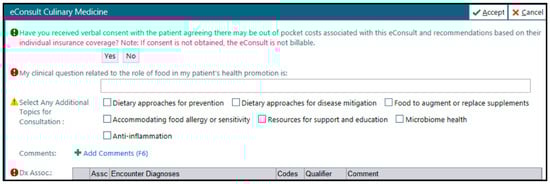 To establish an eConsult process for Culinary Medicine, the physician–dietitian Culinary Medicine team initially engaged the institutional billing team as well as administrative and physician leaders to identify current systems, potential barriers, and opportunities. Due to an existing eConsult workflow across many specialties on our campus, a Culinary-Medicine-specific eConsult was built within the EHR system, creating a straightforward process for consultation that paired an open-ended consult question text box with optional EHR buttons to highlight topics where Culinary Medicine can add value. Figure 1 shows the requesting clinician’s view of the consult within one common EHR.