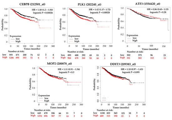 3.3. Increased CEBP-β, and PLK1 Levels Correlate with a Shorter Overall Survival in BC Patients