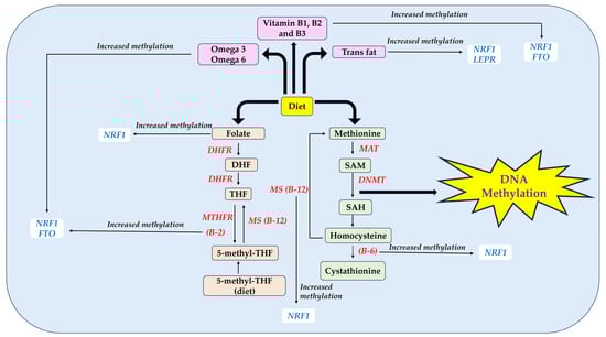 The study explored the association between the DNA methylation of the three genes NRF1, FTO, and LEPR with the nutrient intake of children. DNA methylation is a well-studied epigenetic modification that takes place in the one-carbon metabolism pathway. This process relies on specific enzymes and dietary micronutrients such as folate, choline, and betaine [36]. In this pathway, methionine is converted to S-adenosylmethionine (SAM), which serves as a methyl donor in cells. DNA methyltransferases (DNMTs) use SAM to attach methyl groups to the carbon-5 position of cytosine bases in DNA, resulting in the methylation of DNA [37].
