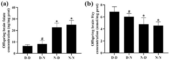 Among the four groups, the D-D group had the lowest folate levels and the highest Hcy levels in the brain tissue of offspring rats. The N-N group had higher folate levels and lower Hcy concentration in the brain tissue of offspring than the D-N group (p < 0.05; Figure 1a,b). The results indicated that folate levels in the brain tissue of the offspring neonatal rats were reduced, whereas Hcy concentrations were increased by the deficiency of parental folate, and the combined effects of folate deficiency in both parents, played a more adverse part, followed by maternal folate deficiency and paternal folate deficiency.