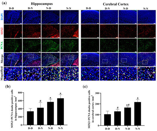 The numbers of proliferating NSCs were quantified to determine if parental folate deficiency could inhibit the proliferation of NSCs in offspring neonatal rats. Immunofluorescence analysis of the hippocampus and cerebral cortex of offspring showed that the D-D group had the fewest PCNA/SOX2-double-positive cells among the four groups, and the D-N group had fewer PCNA/SOX2-double-positive cells than the N-N group did (p < 0.05; Figure 2a–c). These results suggested that parental folate deficiency inhibited NSCs proliferation in the hippocampus and cerebral cortex of postnatal day 0 (PND0) offspring, with maternal folate deficiency producing more adverse impacts.