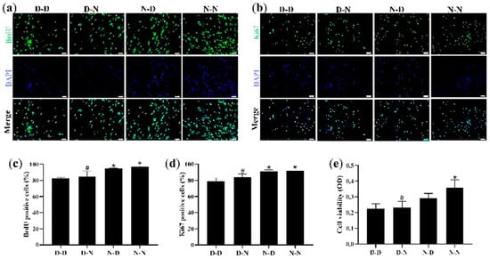 The results showed that the D-D group had the fewest viable cells, fewest BrdU-positive NSCs, and fewest Ki67-positive NSCs, suggesting that parental folate deficiency caused a significant decrease in both markers (p < 0.05; Figure 3a–d). Meanwhile, the N-N group had higher cell viability, more BrdU-positive NSCs, and more Ki67-positive NSCs than the D-N group (p < 0.05; Figure 3e). These results indicated that the proliferative capacity and cell viability of NSCs in the offspring neonatal rats were reduced by parental folate deficiency, with the maternal performing a more detrimental function.