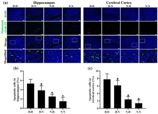 To investigate whether parental folate deficiency could increase the apoptosis of neural cells in offspring, the TUNEL assay was used to assess the apoptosis rate of neural cells in the hippocampus and cerebral cortex of offspring rats. The numbers of apoptotic cells of the D-D group were the most among the four groups, and the N-N group had fewer apoptotic cells than the D-N group did both in the hippocampus and cerebral cortex (p < 0.05, Figure 4a–c). Additionally, there were more apoptotic neural cells in the cerebral cortex of the brain in the rat offspring than in the hippocampus (Figure 4a,b). These results suggested that parental folate deficiency increased the apoptosis of neural cells both in the hippocampus and cerebral cortex of neonatal offspring, and the effects of maternal folate deficiency were more visible than paternal.