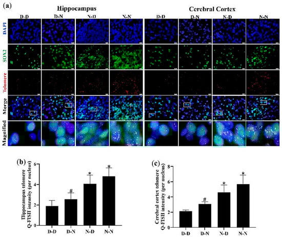 To verify whether the inhibition of proliferation and the increase in apoptosis due to parental folate deficiency on offspring NSCs was associated with telomere shortening of cells, the telomere length of NSCs (SOX2-positive cells) in the hippocampus and cerebral cortex was measured using Q-FISH. As shown in Figure 6, NSC telomere length in the hippocampus and cerebral cortex was the shortest in the D-D group among the four groups. The increased telomere length of NSCs in the hippocampus and cerebral cortex of neonatal offspring was observed in the N-N group compared with the D-N group (p < 0.05; Figure 6a–c). These results revealed that the telomere length of NSCs in the hippocampus and cerebral cortex of neonatal offspring was shortened by parental folate deficiency. Additionally, the combined effects of folate deficiency in both parents played a more adverse part, followed by maternal folate deficiency and paternal folate deficiency. Meanwhile, these results also indicated that telomere shortening might be a potential mechanism by which parental folate deficiency inhibited cell proliferation and increased apoptosis in the NSCs of offspring.