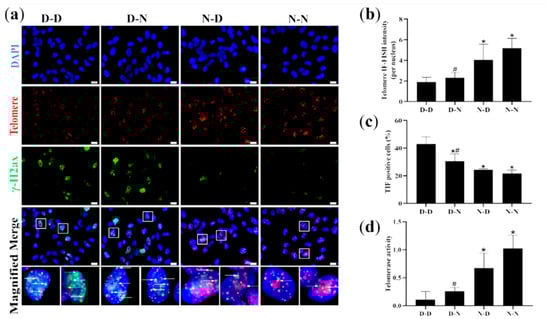 Telomere length, telomeric DNA damage, and telomerase activity of NSCs in vitro. Offspring were grouped as described in Figure 1, and NSCs were cultured as described in Figure 3. (a) Representative micrographs of Immunofuorescence-Fluorescent In Situ Hybridization (IF-FISH) of NSCs in vitro, in which NSCs are stained with anti-phospho-histone H2AX (γ-H2AX) (green), telomere (red) and DAPI (blue). Scale bar = 10 μm. Each below merge column depicts a magnified image of the rectangular region of its corresponding image in the upper merge column Scale bar = 10 μm. (b) Telomere length quantified by IF-FISH in NSCs in vitro. (c) Percentages of telomere dysfunction-induced foci (TIF) cells (containing both C-rich telomere probe-FITC (TelC-FITC) and γ-H2AX) of NSCs in vitro. (d) Telomerase activity of NSCs in vitro. Data are expressed as mean ± SD (n = 5 for each group). *: p < 0.05 compared with D-D group. #: p < 0.05 compared with N-N group.