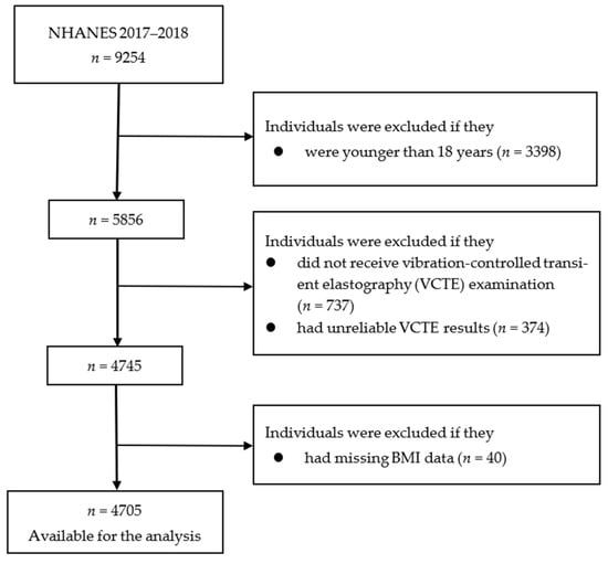 NHANES is a nationwide cross-sectional survey that combines in-person interviews with standardized physical examinations and laboratory tests. Details of NHANES study design, study protocol, and methodology of data collection are available elsewhere []. Written informed consent was obtained from all participants. The US National Center for Health Statistics Research Ethics Review Board approved the NHANES study protocols (Protocol #2011-17; Protocol #2018-01). We excluded 3398 individuals who were younger than 18 years. Participants were additionally excluded if they had no (n = 737) or unreliable (n = 374) VCTE examination data or had missing BMI data (n = 40). Thus, 4705 participants were included in the final analysis (Figure 1).