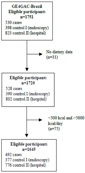 GE4GAC-Brazil is a large, hospital-based, multicenter case–control study carried out in five capitals of different Brazilian regions [17]. Briefly, all cases were diagnosed with GA, confirmed by histology and coded according to the International Classification of Diseases in Oncology (C16). Two control groups were used. Control I group included participants with gastric complaints who underwent endoscopy, with a negative diagnosis for GC or a premalignant lesion. Control II group was composed of hospital participants without a diagnosis of cancer or gastric complaints and who were recruited from non-oncology clinics and from Cancer Prevention Programs. The exclusion criteria for participants were previous malignancy, except for non-melanoma skin cancer; participants with impaired mobility due to illness or mental and cognitive conditions that prevented them from understanding the questions asked by the interviewers; and cases that had been diagnosed with GA more than two years prior to the interview or those with advanced cancer (i.e., terminal stage with no feasible chance of survival). The study was approved by the Committee on Ethics in Human Research of Antônio Prudente Foundation—A.C. Camargo Cancer Center, as well as the local ethics committees of the study centers, under registration on the Brazil platform linked to the National Health Council of Brazil (grant nº 4708881–February 2016, registration CAAE: 53166915.9.1001.5432). All participants provided written informed consent for data collection and storage.