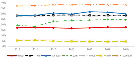 The structure of grain consumption in China has changed significantly even in the last decade. The proportion of feed grain in total grain consumption rose from 38.8% in 2013 to 43.0% in 2019, while the ratio of staple food grain fell from 32.6% in 2013 to 27.9% in 2019. The proportions of seed grain, industrial grain, and other grains were more stable during this period, ranging from 28.5% to 30.3% (Figure 2). Based on the information from Figure 2, we set the upper and lower bounds on non-food grain to be: = 30.3%, = 28.5%.