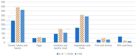 Much of the literature used the concept of a standard person and expressing the requirement of a person of age i relative to a standard age group. According to FAOSTAT, a person aged 17–18 years old had the highest energy demand, which then falls with age. On average, the energy demand of a 60–69-year-old person is 70.3% of the peak value by age, while an 80–89-year-old person has a ratio of 49.9% [41]. For the food consumption by differently aged persons in China, a national survey conducted by the University of Chinese Academy of Sciences (UCAS) in 2017 [42] shows that the volume of food consumption was the highest for those aged 15–64 for all types of food except for milk and dairy products (see Figure 3).