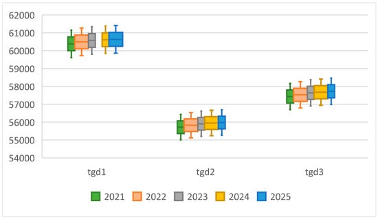 China’s population and its structure are the main drivers of GD and they are currently undergoing significant changes, including faster aging and new fertility policies [45,46]. In 2021, China officially relaxed its family planning policy further, supporting couples who wish to have a third child. As of the end of 2022, the total domestic population was 1411.8 million, a decrease of 0.85 million from the previous year. The total birth population in 2022 was 0.96 million, and the birth rate was 6.77‰. The total number of deaths was 10.41 million, and the mortality rate was 7.37‰, and the natural growth rate of the population was −0.60‰. This marks the first negative growth of the population in many years. A total of 15.6% of the population is projected to be older than 65 in 2025 [45,46]. The changing population size and, particularly, the aging of the population have been impacting China’s GD and will continue to have significant impacts. In the model, we adopt the standard person consumption ratios, , and the population size, , to reflect these changing trends.