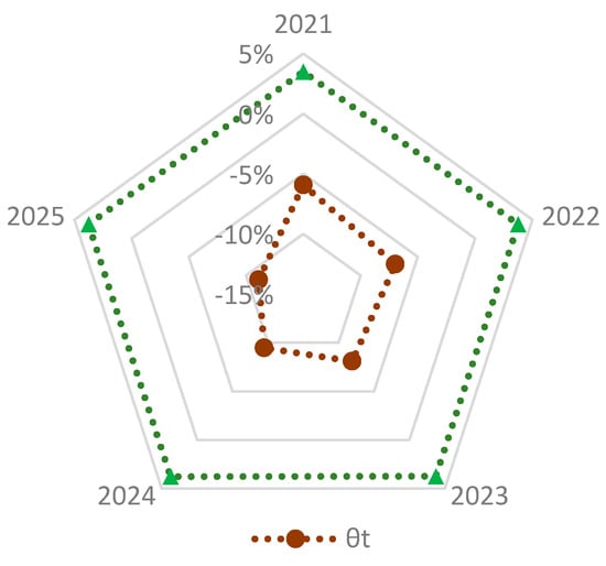 Although aging and a falling population would reduce GD, changes in urbanization would raise it. In S1, annual GD would rise by 0.9% in 2022, and by 1.2%, 1.5%, 1.8% in 2023, 2024, and 2025, respectively. In S2 the diet guidelines are achieved and Figure 4 shows how GD there would be smaller than in S1; the difference between them, (Equation (28)), would increase over time, from 43.82 million tons in 2022 to 73.10 million tons in 2025. Accordingly, the difference rate, , would increase in absolute terms from 5.9% in 2022 to 11.1% in 2025 (Figure 5). That is, if Chinese residents fully adopt the DGCR 2022 guidelines, GD would be lower by about 73.10 million tons in 2025, equivalent to 10.7% of China’s grain production in 2021 and about 2.5% of the world grain production in 2020. The results indicate that promoting the diet guidelines more widely would generate a double dividend—a healthier population and a reduction of about 43.82–73.10 million tons of China’s GD annually during 2022–2025, which, in turn, would reduce the pressure on scarce water and land.