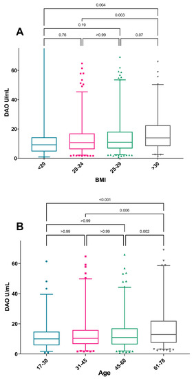 Median DAO-activity by (A) BMI category and (B) age category. The Mann–Whitney U-test was used for comparison of DAO median levels between age groups. Box-plot depicting range of Q1–Q3 and median with whiskers showing range of 2.5–97.5 percentile. Outliers shown as individual values.