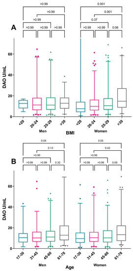 Median DAO-activity by sex, (A) BMI category, and (B) age category. The Mann–Whitney U-test was used for comparison of DAO median levels between age groups within each sex. Box-plot depicting range of Q1–Q3 and median with whiskers showing range of 2.5–97.5 percentile. Outliers shown as individual values.
