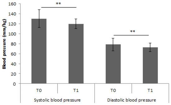 The first parameter analyzed was blood pressure. The results showed significant difference between T0 and T1. Systolic blood pressure decreased from T0 to T1 (130.40 ± 17.81 vs. 120.0 ± 9.58; p < 0.01), while diastolic blood pressure decreased from T0 to T1 (78.69 ± 12.60 vs. 72.89 ± 8.50, p < 0.01) (Figure 1).