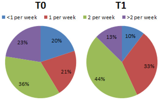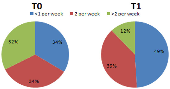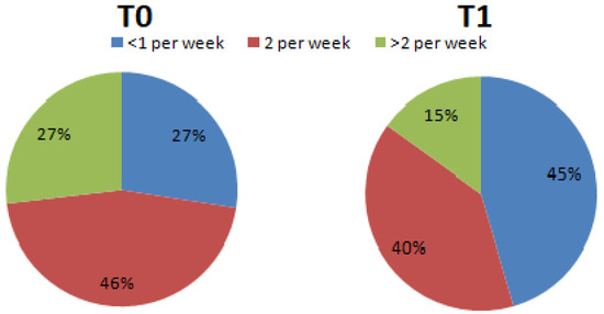 The portions of sweets consumed per week (Question 11) changed from T0 (<1 per week = 33.75%; 2 per week = 33.75%; >2 per week = 32.5%) to T1 (<1 per week = 49.1%; 2 per week = 38.9%; >2 per week 12%) (Figure 2).