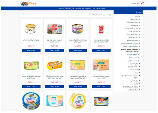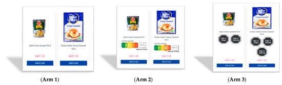 For this study, products were primarily selected from an online store of a large Saudi supermarket, called Danube (https://danube.sa/ (accessed on 26 May 2023)) [46], to represent as many food categories as possible and subsequently reviewed by the KSA Public Health Authority. We then collected product-specific information from various online sources, including the Danube website. We dropped the products for which we could not find nutritional information. As a result, the store contained 1969 food and beverage products commonly purchased in Saudi Arabian supermarkets. Food items were classified into one of 23 categories (on average, 199 unique products per category), and then by subcategories (on average, 69 unique products per subcategory) within the broader category (e.g., dairy and eggs were subcategorized as butter and margarine spreads; cheese slices, blocks, and cubes; cheese spreads and labneh; cream, creamer, and condensed milk; fresh cream, etc.). The list of the category-subcategory pairs used for the store is found in Table S1. All products include the item’s name in the local language, a picture of the item, retail price, product description, and nutritional information available via click-through. Figure 2 presents a screenshot of the default version of the grocery store webpage, which was used for the control arm of the study.