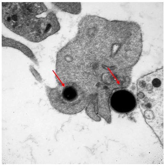 Numerous cells of the immune system are involved in the fight against cancer. Lymphocytes are the first line of defence. The T and B (tumour-infiltrating lymphocytes) subpopulations are well known to, without any geometric modification, kill tumour cells. The NK subpopulation of lymphocytes is also the first line of destruction of cancer cells. Other cells which may potentially play a role in the fight against cancer are thrombocytes. This ability might result from their large number and wide distribution within the circulatory system. Predominantly known for their role as primary mediators of coagulation, this function links them with the occurring inflammatory processes. Platelets, by their biological mediators, can modulate immune response by intracellular crosstalk with leukocytes, lymphocytes, monocytes, and endothelial cells. Thrombocytes play a role in cancer metastases through the transfer of cancer cells and tumour angiogenesis by releasing different factors from their surface, α-granules, and dense granules [10,11,12]. Mustard et al. in 1968 showed that blood platelets have the capacity to phagocytise [13]. Having an ability of chemotaxis and diapedesis, they are able to phagocytise bacteria, viruses, antibody complexes, collagen, and latex particles, working both as single platelets as well as in aggregates [14,15]. Upon activation, thrombocytes change their shape from discoid to an irregular shape with numerous projections. This morphological change is accompanied by the intensification of energetic processes and enhanced protein anabolism inside the activated platelet [16]. In Figure 1, a photo taken with an electron microscope documents the phagocytosis of bacteria with electron-dense elementary bodies. The phagocytic ability of blood platelets in cancer has not been fully determined.