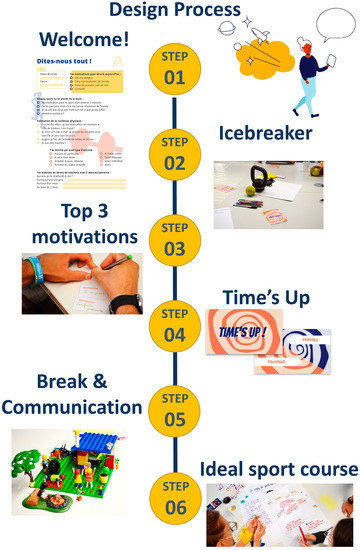 The workshop took place on 22 September 2021 (two half-day sessions). Students could engage in several co-construction activities, divided into three or four groups. Each session lasted approximately 3 h, depending on the context and the number of groups. Each consisted of the following steps: (1) welcome questionnaire (10 min), (2) icebreaker (15 min), (3) motivations (20 min), (4) Time’s Up!© (25 min), (5) break and communication (15–20 min), and (6) ideal course (1.5 h). The step-by-step design process is illustrated in Figure 1.
