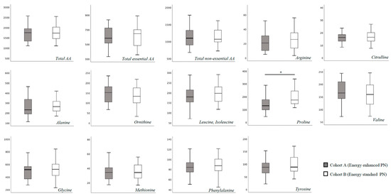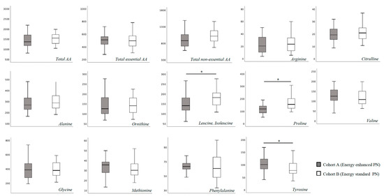 In Table S1 we report the blood AA levels of the study population, overall and according to cohort assignment. No substantial difference was found for total essential and non-essential blood AA concentration at T0 between the two study cohorts (Figure 1). Specifically, only proline showed a higher blood concentration in Cohort B compared to Cohort A (Figure 1). At 15 days of life, we found a significantly higher concentration of leucine, isoleucine and proline, and a significantly lower concentration of tyrosine in Cohort B (Figure 2).