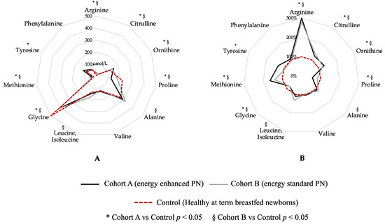 Graphical comparison of amino acid levels in the two study cohorts compared to healthy breastfed-at-term newborns. Figure legend: PN (parenteral nutrition). (A) Blood amino-acids expressed in µmol/L; (B) Blood amino-acid expressed in percentage, considering Control group (dashed red circle) as 100%.