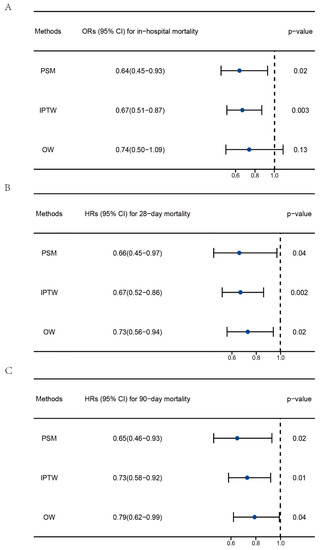 The selection bias in the cohort study might affect the reliability of the results [28]. Inverse probability of treatment weighting (IPTW) and OW are widely adopted approaches to handle selection bias and account for confounders [60,61,62]. We found that OW had a better performance at balancing baselines to minimize selection bias compared to IPTW in our study participants (Figure S1). In the IPTW cohort, vitamin D supplementation was associated with lower in-hospital, 28-day and 90-day mortality risk, and vitamin D supplementation was associated with lower 28-day and 90-day mortality risk post decline to a minimum selection bias using OW in patients with sepsis. Hence, by using IPTW and OW analyses, we further validated the results in our study participants.
