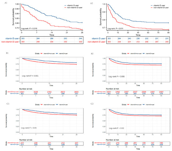 Survival analysis between vitamin D users and non-vitamin D users post PSM, IPTW, and OW. (A1,A2) Kaplan–Meier survival curves of the two groups within 28 days and 90 days post PSM. (B1,B2) Kaplan–Meier survival curves of the two groups within 28 days and 90 days post IPTW. (C1,C2) Kaplan–Meier survival curves of the two groups within 28 days and 90 days post OW. The y axis shows the survival probability of patients over time, and the table of numbers at risk shows the number of survivors at each time point. PSM, propensity score matching; IPTW, inverse probability of treatment weighting; OW, overlap weighting.