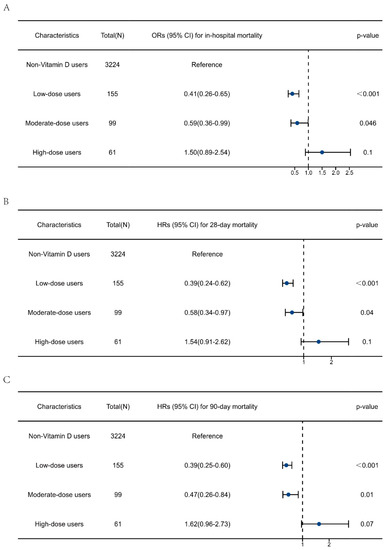 Multivariate modeling of the relationship between vitamin D supplementation and in-hospital mortality was explored using a logistic regression model, and a Cox regression model was employed to reveal the relationship between vitamin D supplementation and 28-day or 90-day mortality. All potential confounders were analyzed in the multivariate regression models. The effect of vitamin D supplementation was presented as odds ratio (ORs) with a 95% confidence interval (CI) for in-hospital mortality and hazard ratio (HRs) with a 95% CI for 28-day and 90-day mortality.