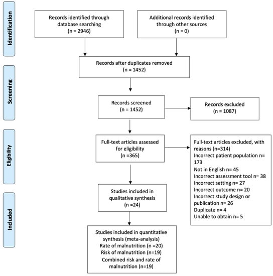 The initial search yielded 2946 studies. After the removal of 1494 duplicates, 1452 studies were screened via their title and abstract. This resulted in 365 full-text articles assessed for eligibility, with 24 studies included for analysis. Studies that did not specifically report on the number of those with dementia [,] were excluded. See Figure 1 for the PRISMA flow chart. Fifteen studies were cross sectional [,,,,,,,,,,,,,,], three were randomized control trials [,,], two were prospective cohort studies [,], two were observational studies [,], and two were pre–post intervention studies [,].
