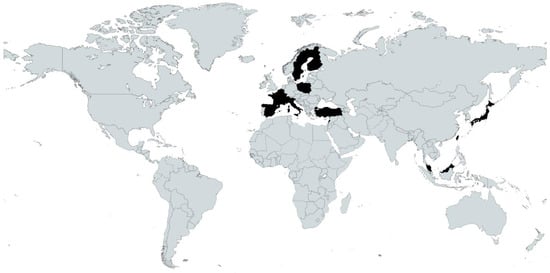 - MapChart.com. World Map—Simple: Create a Custom Map. MapChart. Available online: https://www.mapchart.net/world.html (accessed on 22 May 2023).