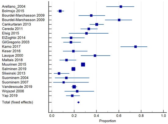 Forest plot of prevalence of malnutrition using random effects model. Q = 340.02, DF 20, p < 0.0001, I2 = 94.12%, 95% CI for I2 = 92.22–95.55. Publication bias—Egger’s Test, intercept = 0.99, 95% CI = −1.91–3.89, p = 0.48. Data from references [,,,,,,,,,,,,,,,,,,,].