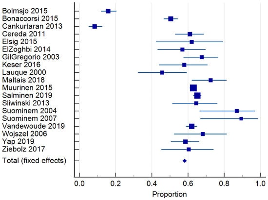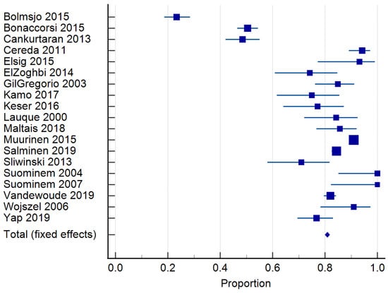 Forest plot of combined prevalence of those malnourished and at risk of malnutrition using random effects model. Q = 1142.78, DF = 18, p < 0.0001, I2 = 98.42%, 95% CI = 98.09–98.70. Publication bias—Egger’s test, intercept = −2.43, 95% CI =−8.53–3.67, p = 0.41. Data from references [,,,,,,,,,,,,,,,,,,].