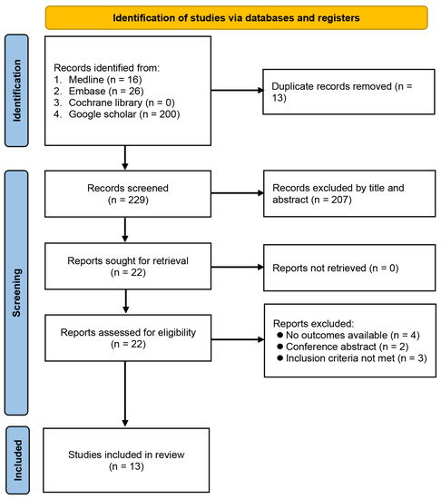 The process of study identification from database searches is demonstrated in Figure 1. Initially, we identified 242 records, of which 220 were removed because they were duplicate publications (n = 13) or did not meet the selection criteria (n = 207). Full-text review was independently performed by two authors on the remaining 22 publications, of which 13 met our predefined criteria for inclusion. The 13 eligible articles were retrospective studies published between 2019 and 2022, including a total of 9185 patients [12,17,19,20,21,22,23,24,25,26,27,28,29].