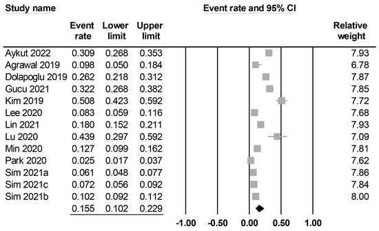 The characteristics of the included studies are summarized in Table 1. All studies included middle-aged patients (mean or median age: 44 to 69 years), with male proportions ranging between 56.8% and 88%. Twelve studies reported details on body mass index (i.e., 20–31 kg/m2), while this information was unavailable in one study [20]. Among the included studies, seven explicitly reported the exclusion of patients with chronic kidney disease [12,20,22,25,27,28,29], whereas five did not specify whether such exclusions were made [17,19,21,23,26]. Contrarily, one study reported a chronic kidney disease incidence of 5.6% among the study population [24]. Preoperative creatinine levels were available in nine studies (Supplemental Table S2) [12,19,21,22,23,25,26,28,29], whereas five studies did not provide this information. There was a wide variation in sample size among the studies, with a range of 41–3543. The 13 included studies focused on three major surgical approaches, including cardiac surgery (n = 5) [12,21,22,24,25], abdominal surgery (n = 5) [19,20,27,28,29], and lung surgery (n = 3) [17,23,26]. Four studies reported surgical procedures were performed electively [12,19,28,29], while other studies did not specify this information. In all the included studies, the prognostic nutritional index (PNI) was calculated using the formula [10 × serum albumin (g/dL)] + [0.005 × total lymphocyte count (count/mm3)]. The cut-off values of PNI were available in eight studies [17,19,20,21,23,24,25,26], while they were not mentioned in five studies [12,22,27,28,29]. The definition of PO-AKI was summarized in Supplemental Table S2. Among the included studies, five used the Kidney Disease Improving Global Outcomes (KDIGO) classification (stages I–III) [19,21,22,28,29] and two used the Acute Kidney Injury Network (AKIN) classification (stages II–III) [17,27] to define the occurrence of PO-AKI. Furthermore, five studies defined PO-AKI based on an increase in serum creatinine from baseline, such as a minimum increase of 0.3 mg/dL or a twofold elevation in creatinine level compared with preoperative values [12,23,24,25,26]. However, one study did not provide specific information regarding the PO-AKI definition used [20]. The incidence of PO-AKI was reported in all studies (ranging between 2.5% and 50.8%), with a pooled incidence of 15.5% (95% CI: 10.2% to 22.9%) (Figure 2). Studies were conducted in four countries, including India (n = 1) [20], China (n = 2) [25,26], Turkey (n = 3) [12,21,22], and Korea (n = 7) [17,19,23,24,27,28,29]. The quality of the studies is summarized in Table 1. Of 13 studies, one study was considered low quality (i.e., NOS < 7) [29], while the other 12 studies were considered high quality.