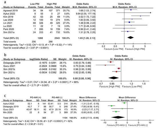Forest plot showing (a) the risk of postoperative acute kidney injury (PO-AKI) in patients with a low or high prognostic nutritional index (PNI) [17,19,20,21,23,24,25,26], (b) the association of PO-AKI risk with PNI value as a continuous variable [12,22,28,29], and (c) the difference in PNI values in patients with or without PO-AKI [12,21,22,27]. CI: confidence interval; M–H: Mantel–Haenszel; IV: inverse variance; SD: standard deviation; SE: standard error. The studies’ effect sizes are represented by squares, while the pooled effect is depicted as a diamond.