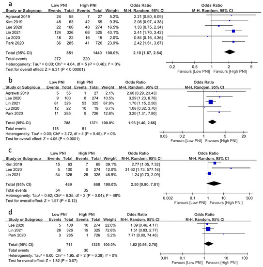 The associations of PNI with the risks of other postoperative complications are demonstrated in Figure 4. A low PNI was related to an increased risk of postoperative infection (OR = 2.1, 95% CI: 1.67 to 2.64, p < 0.00001, I2 = 0%, six studies, 2291 patients, sensitivity analysis: consistent) (Figure 4a) [20,23,24,25,26] and mortality (OR = 1.93, 95% CI: 1.4 to 2.66, p < 0.0001, I2 = 0%, five studies, 2159 patients, sensitivity analysis: consistent) (Figure 4b) [17,20,24,25,26]. Despite the lack of a significant correlation between PNI and the risks of postoperative bleeding and stroke, a low PNI tended to be associated with a higher risk of postoperative bleeding (OR = 2.5, 95% CI: 0.8 to 7.81, p = 0.12, I2 = 68%, three studies, 1157 patients, sensitivity analysis: consistent) (Figure 4c) [17,18,19] and stroke (OR = 1.62, 95% CI: 0.96 to 2.7, p = 0.07, I2 = 0%, three studies, 2036 patients, sensitivity analysis: consistent) (Figure 4d) [17,24,25].