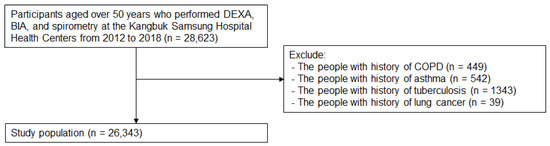 Individuals aged over 50 years who underwent dual-energy X-ray absorptiometry (DEXA), bioelectrical impedance analysis (BIA), and spirometry were included (n = 28,623) (Figure 1). The participants who have (1) a history of COPD (n = 449), (2) a history of asthma (n = 542), (3) a history of tuberculosis (n = 1343), and (4) a history of lung cancer (n = 39) were excluded. Accordingly, the remaining 26,343 participants were included in this cohort study (Figure 1). This study was conducted in accordance with the Declaration of Helsinki. Ethics approvals were obtained from the Institutional Review Board (IRB) of Kangbuk Samsung Hospital (Number: 2021-12-048). Informed consent was waived because researchers retrospectively achieved a de-identified database for analysis.