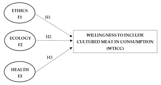 Based on the defined constructs, SEM was carried out with the aim of determining the influence of individual factors (ethics, ecology and health) on the willingness to include cultured meat in consumption.